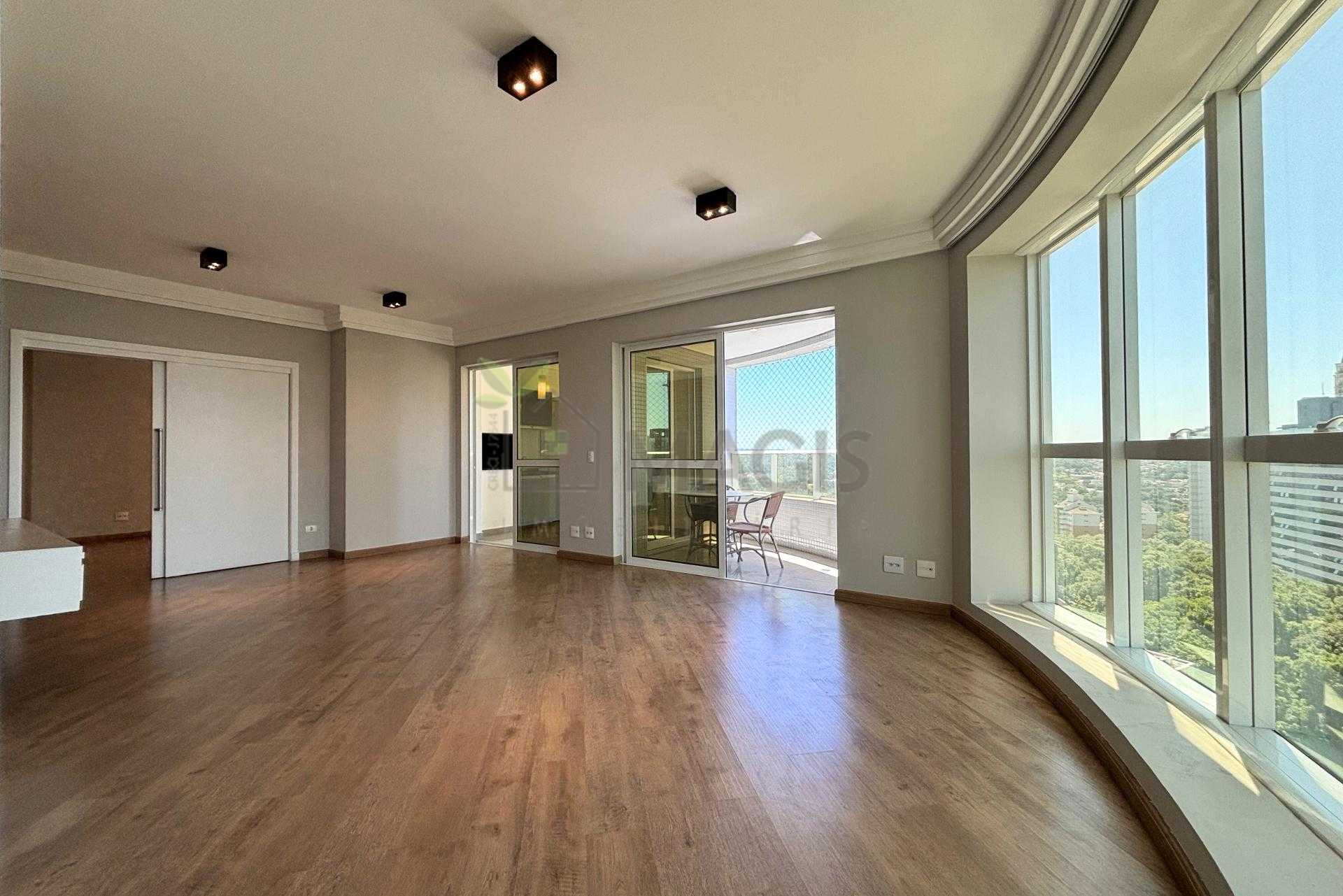 * Ampla sala de estar com rack e esquadrias do teto ao chão, proporcionando excelente iluminação natural e vista para o Ecoville