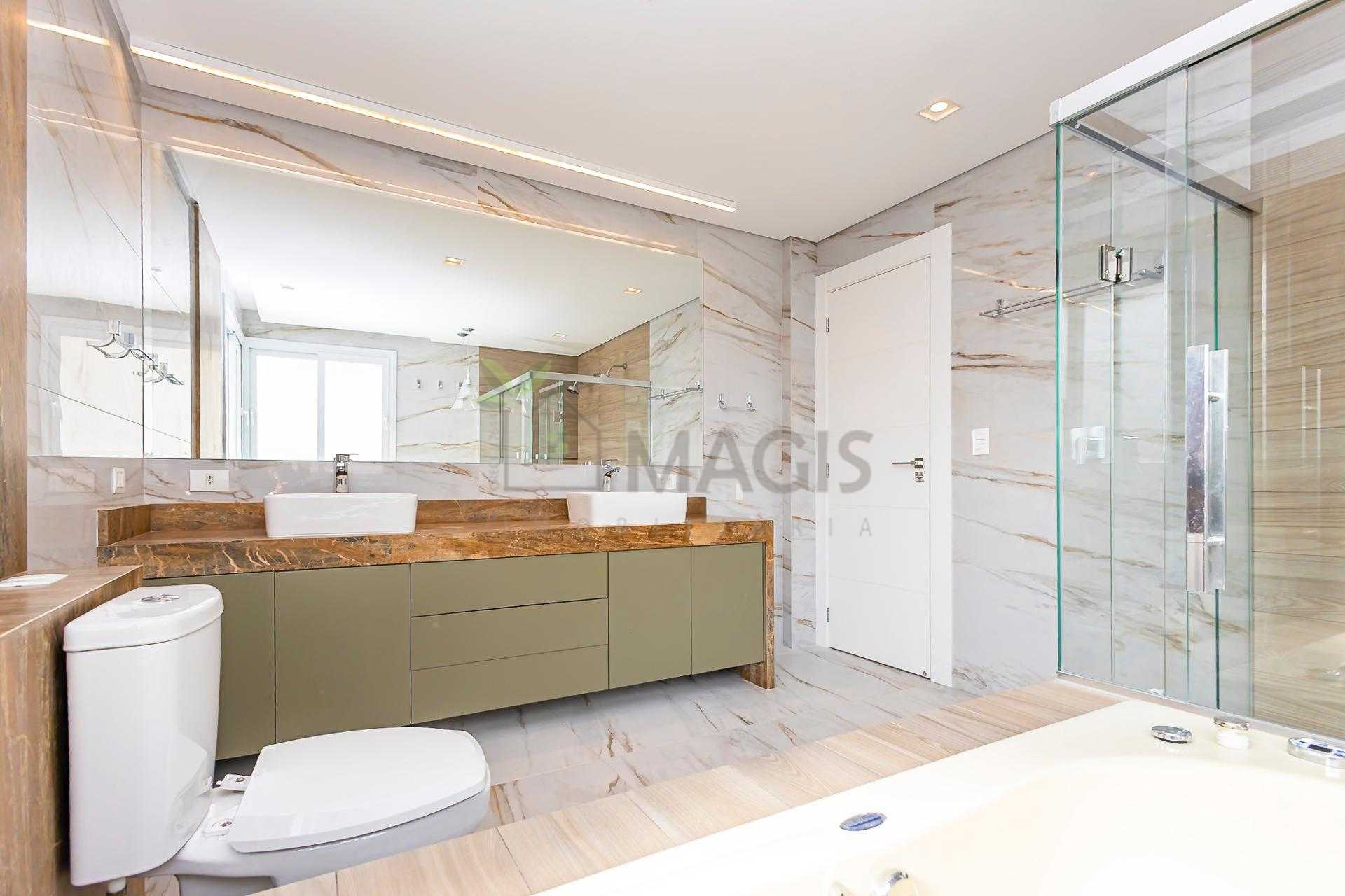 Suíte master com 2 chuveiros, 2 cubas e banheira hidro.