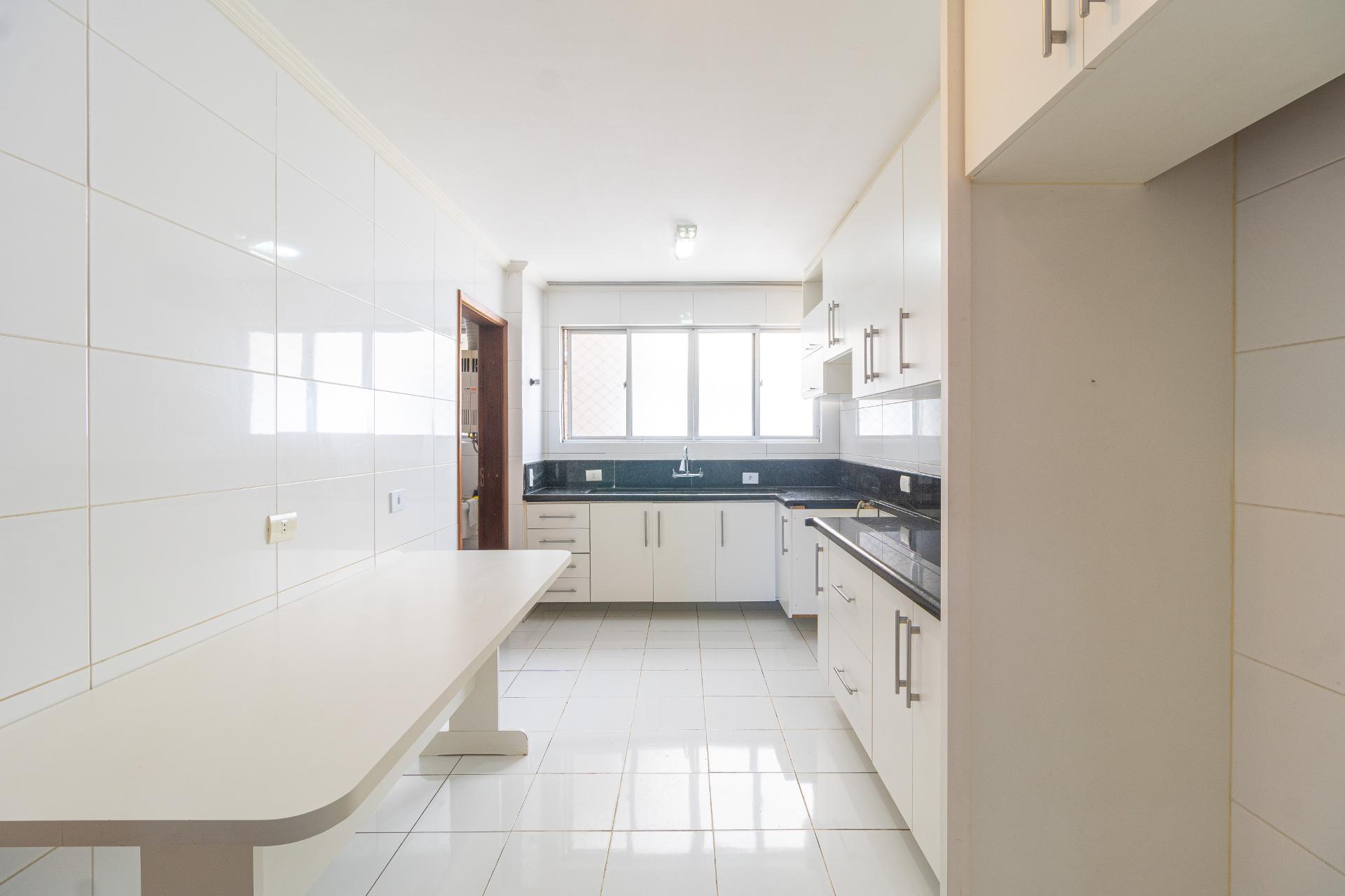 Cozinha planejada, mobiliada, espaçosa e funcional, com mesa e despensa