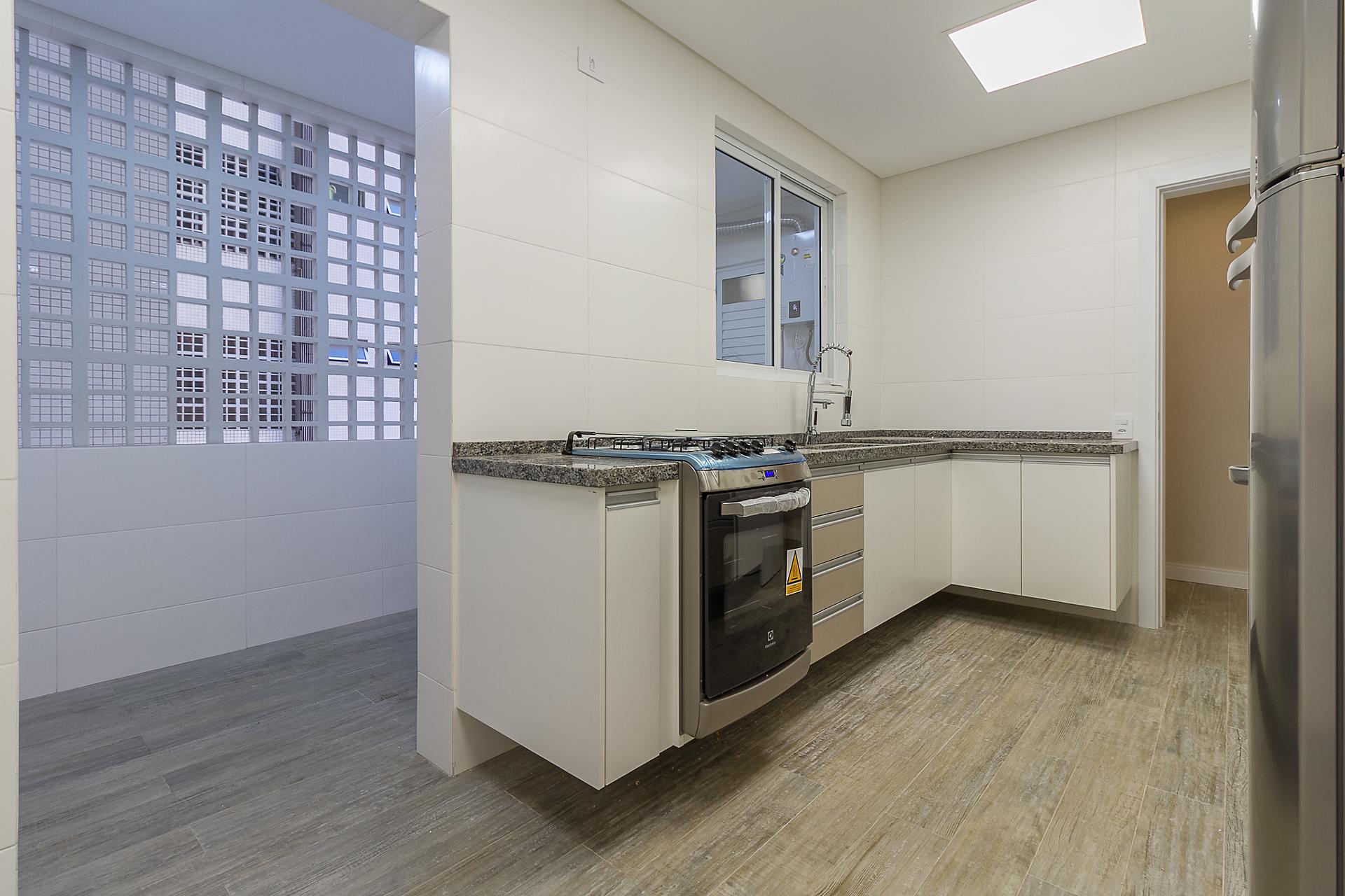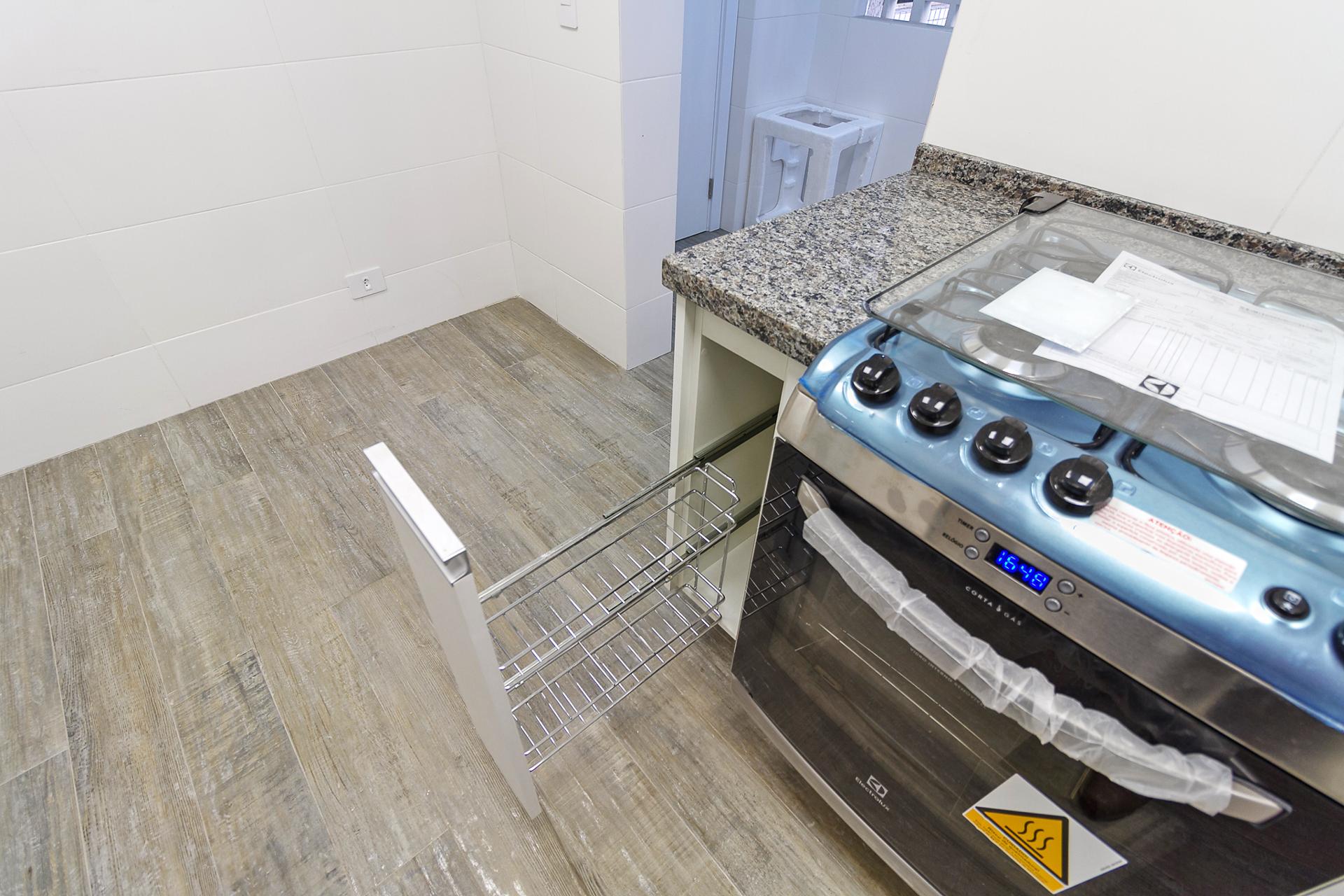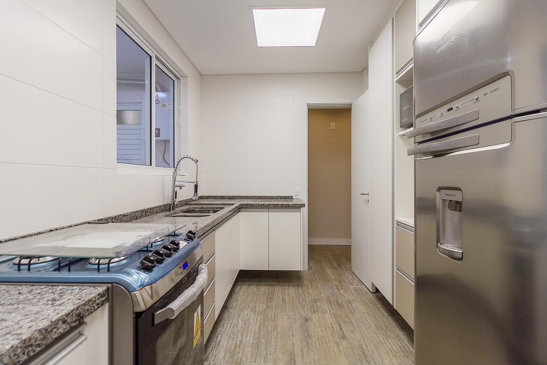 Com 101,42 m² de área privativa, o imóvel é bem ventilado e iluminado. Possui três quartos, sendo uma suíte com armários planejados, além de sala integrada, lavabo e cozinha equipada com armários.