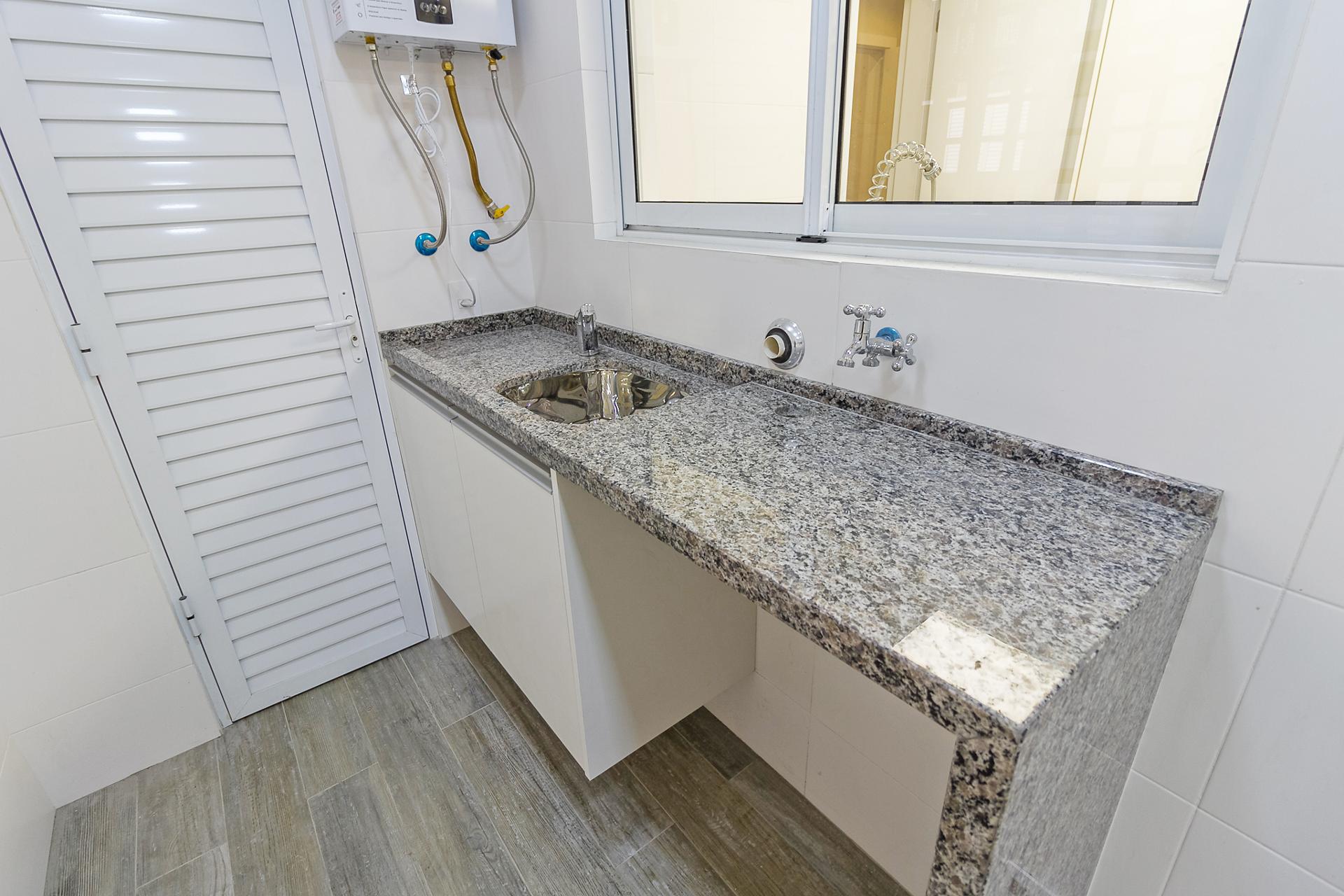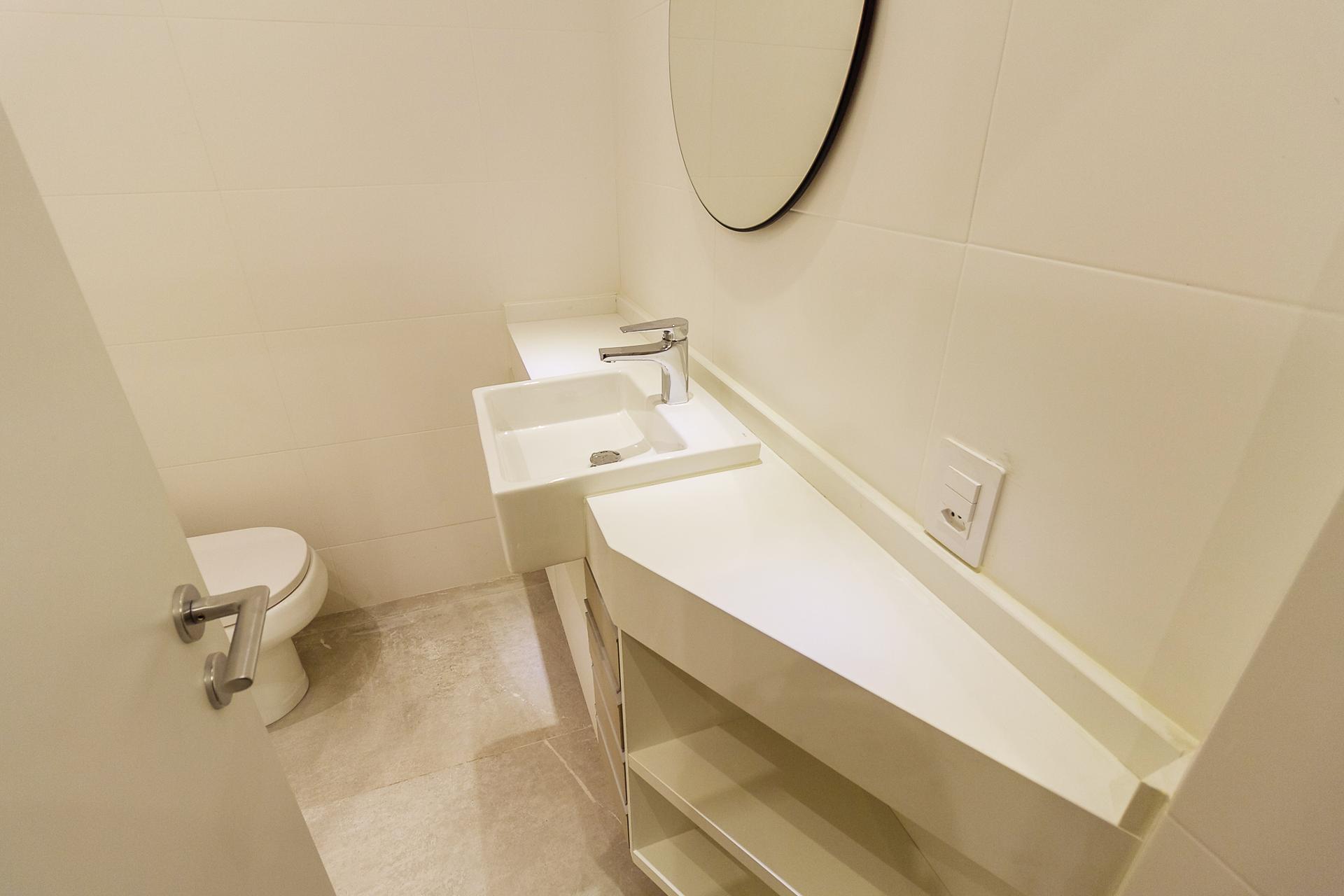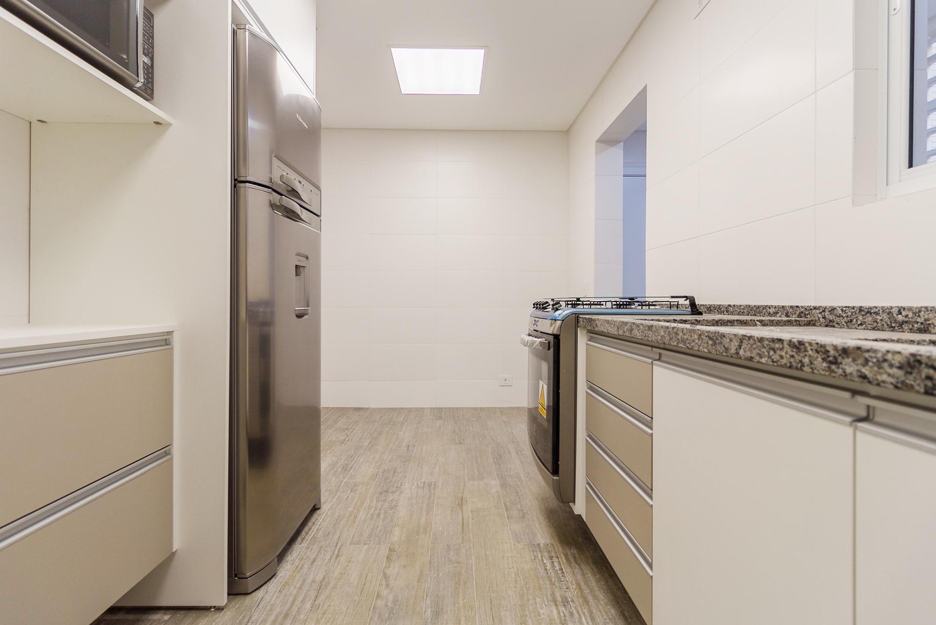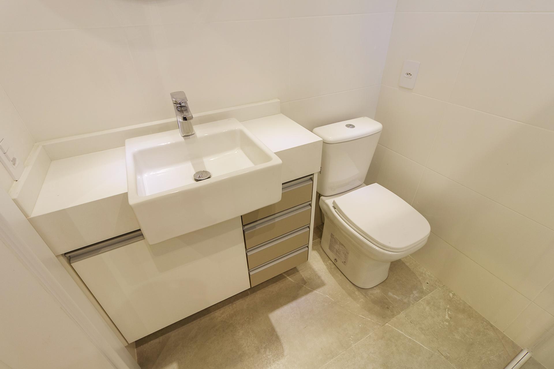 Com 101,42 m² de área privativa, o imóvel é bem ventilado e iluminado. Possui três quartos, sendo uma suíte com armários planejados, além de sala integrada, lavabo e cozinha equipada com armários.