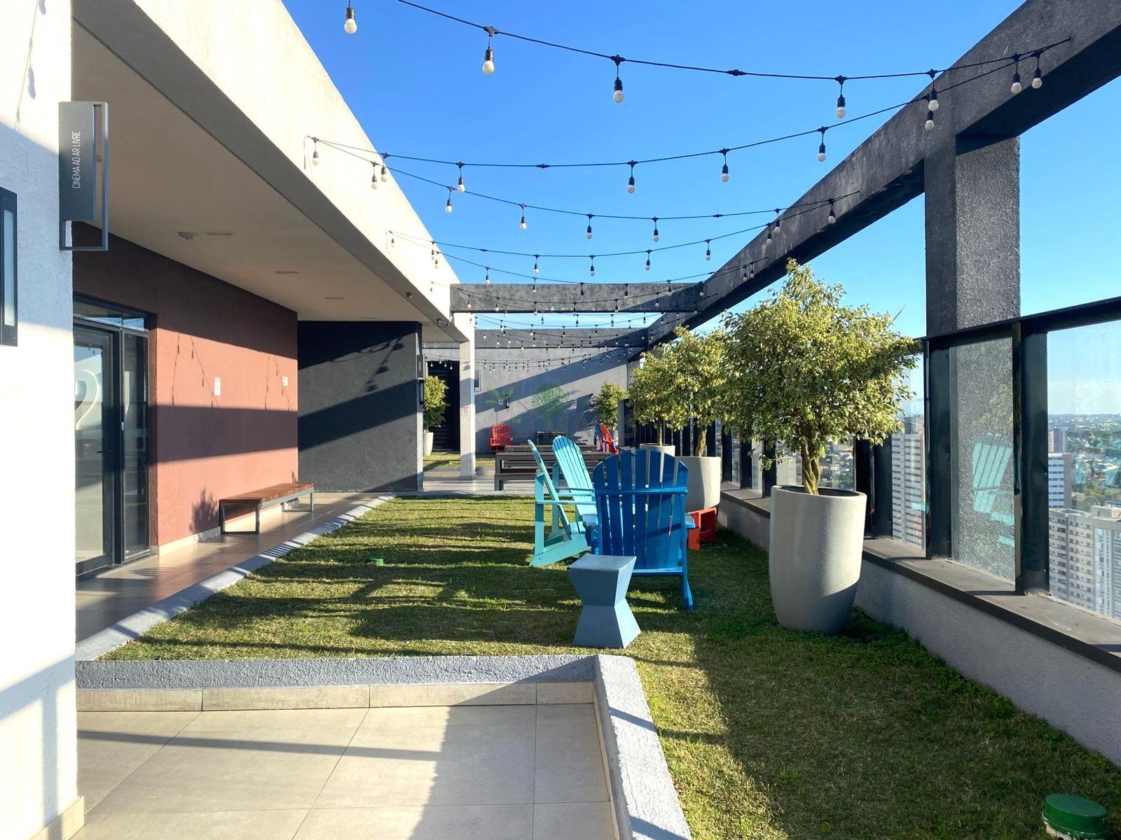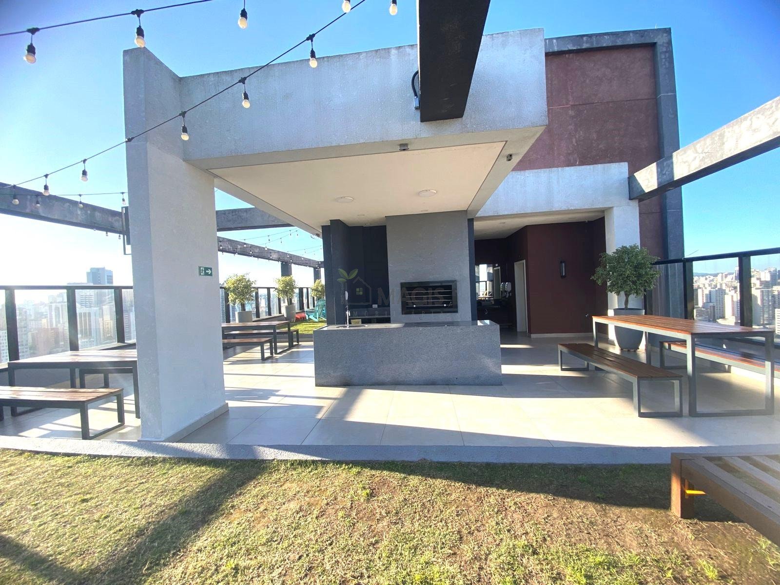 Roof top com churrasqueira, cadeiras pra aproveitar o sol e grama natural