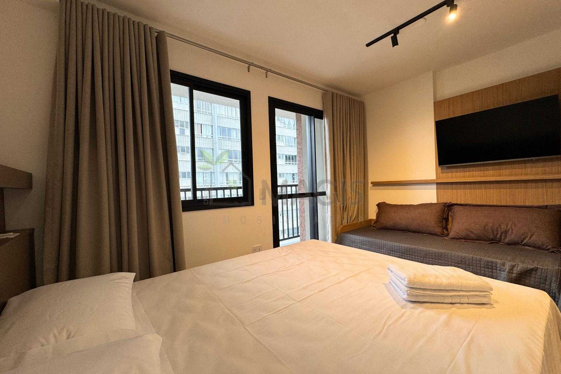 - Studio mobiliado, com móveis planejados e decoração contemporânea
