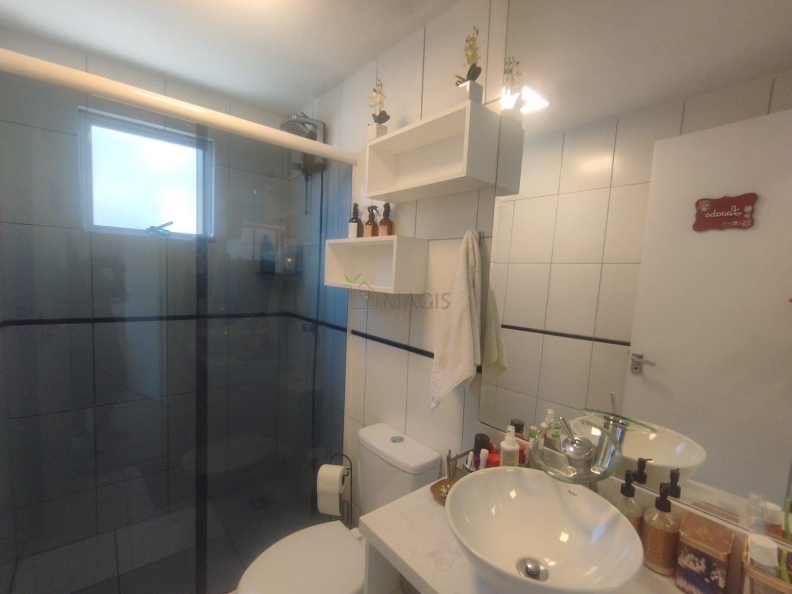 Banheiro social com box em vidro temperado e armário planejado, proporcionando funcionalidade e organização.