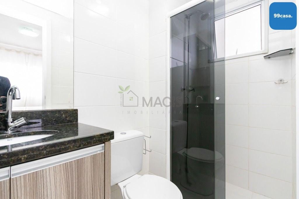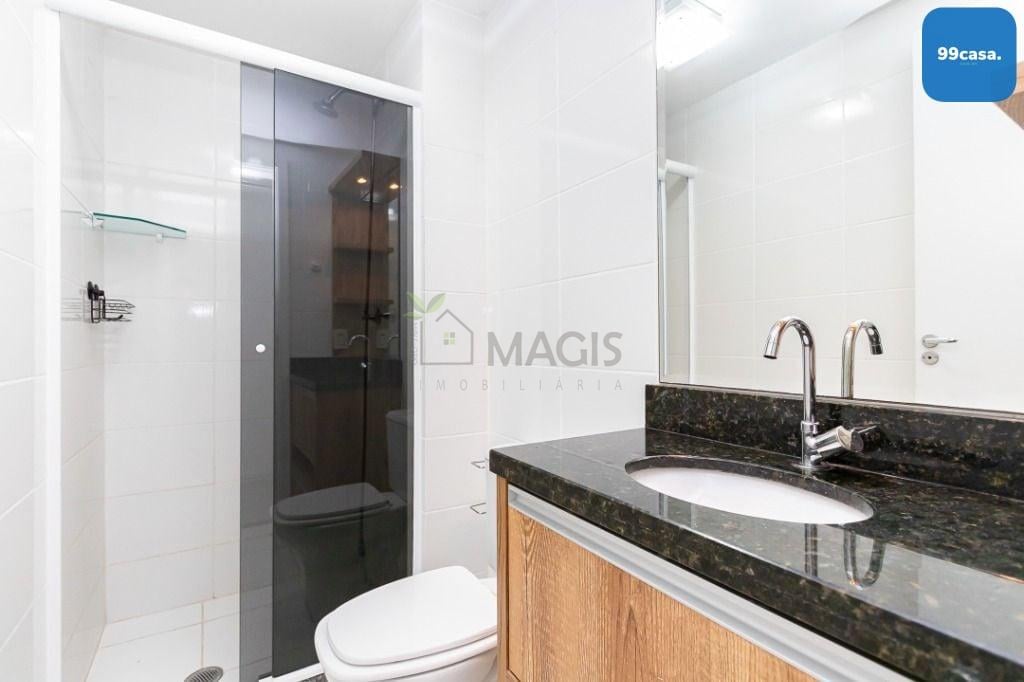- Banheiro social com box de vidro e armários planejados