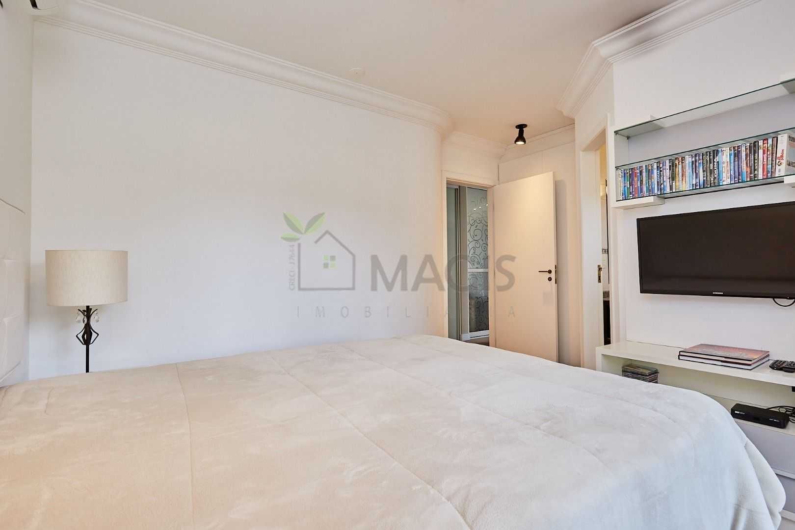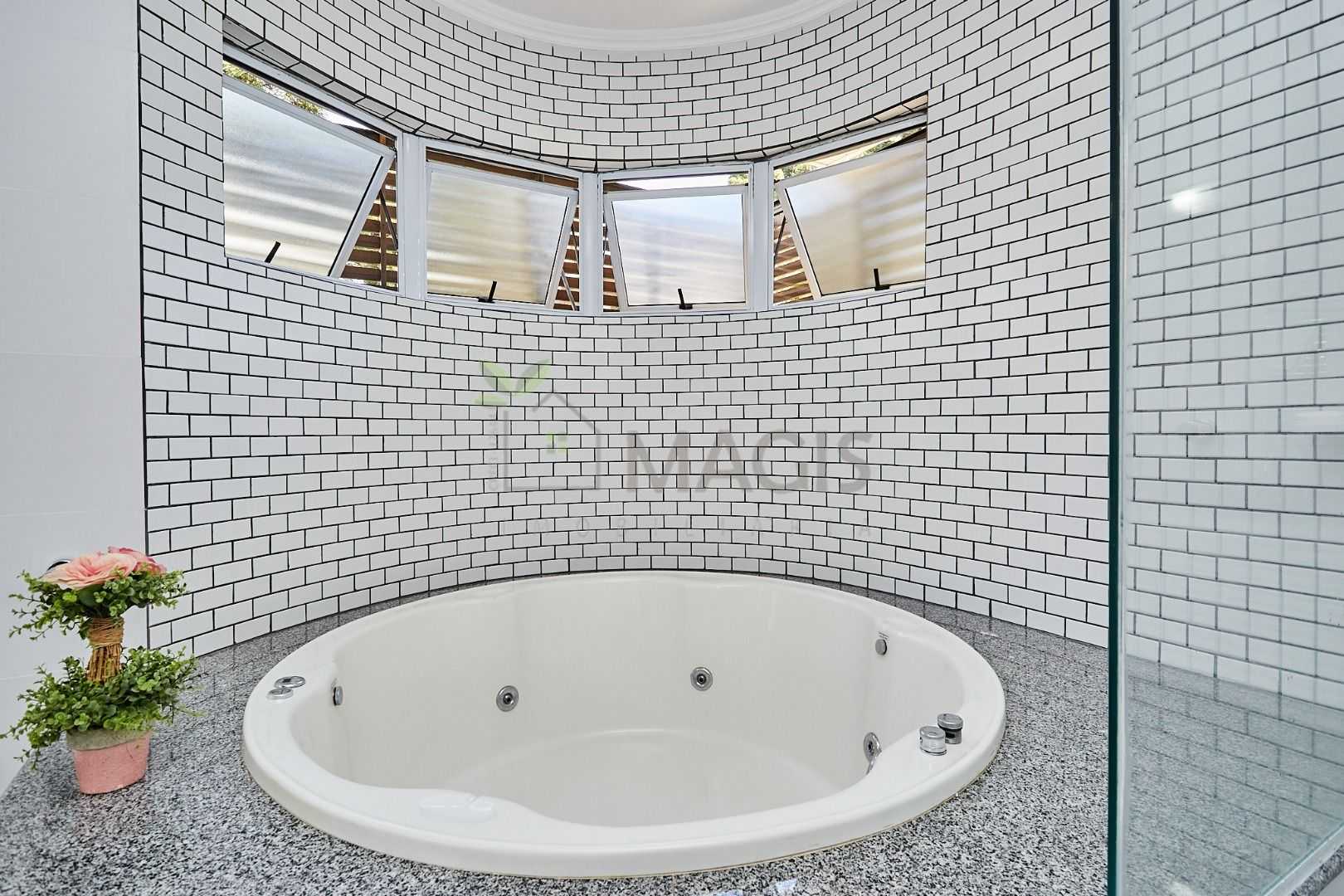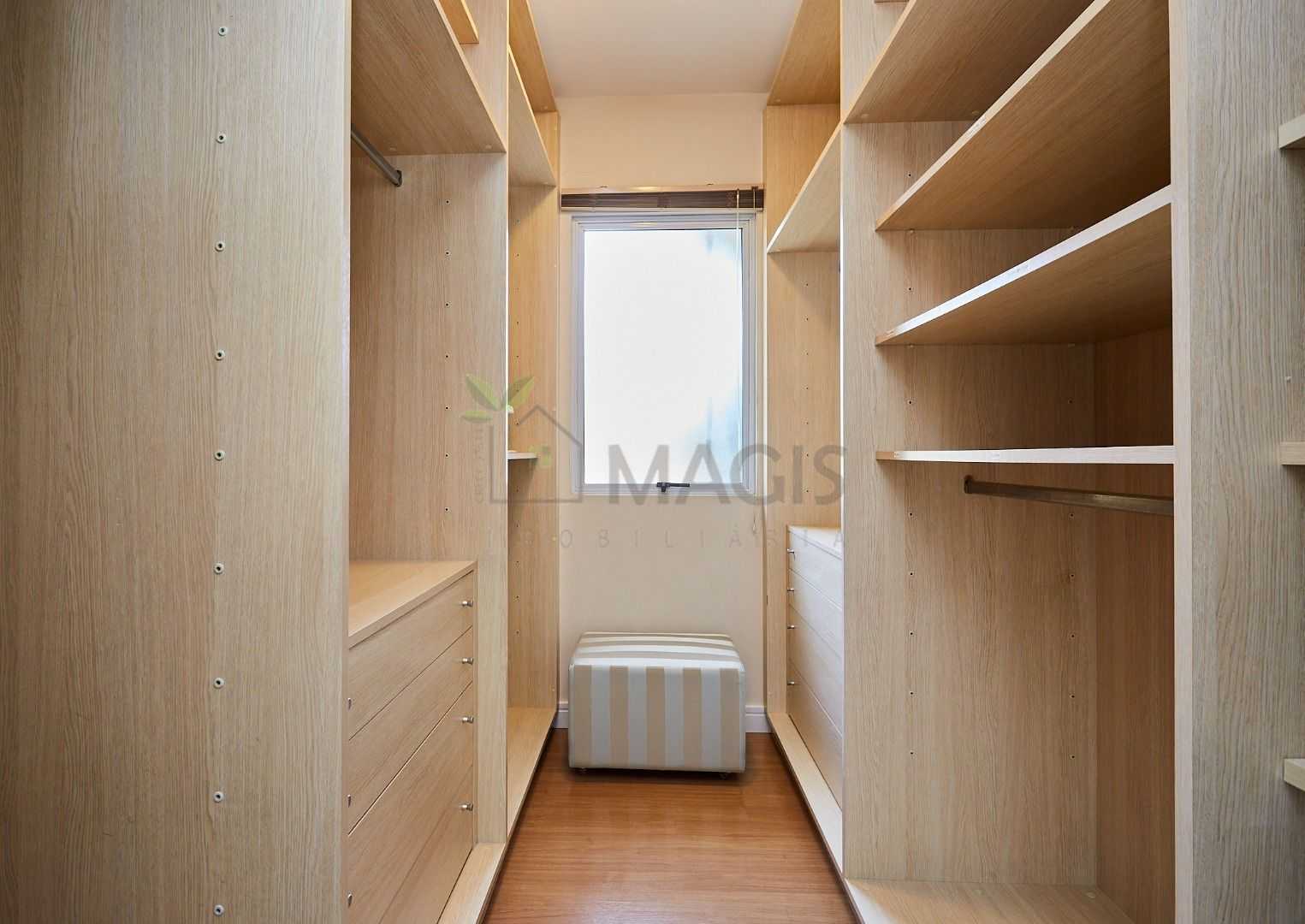 Suíte master exclusiva: amplo closet, banheiro com hidromassagem e bancada com cubas duplas.