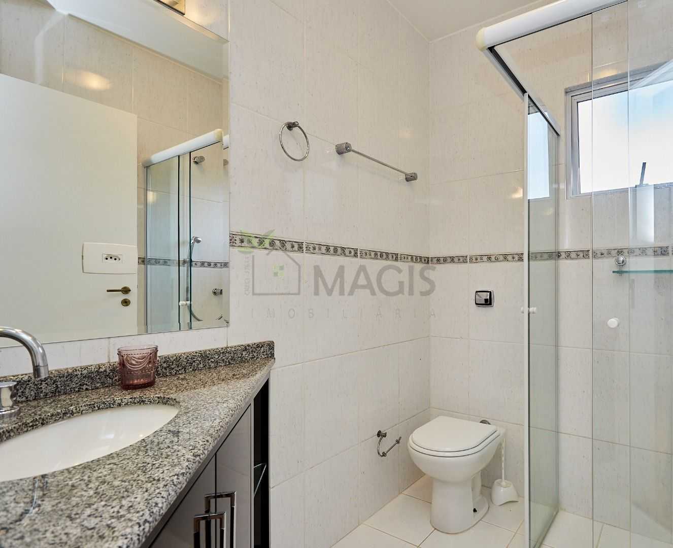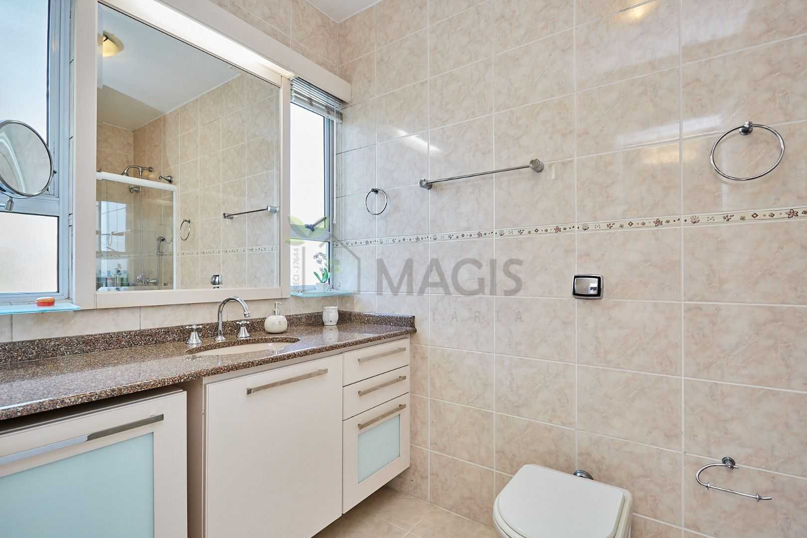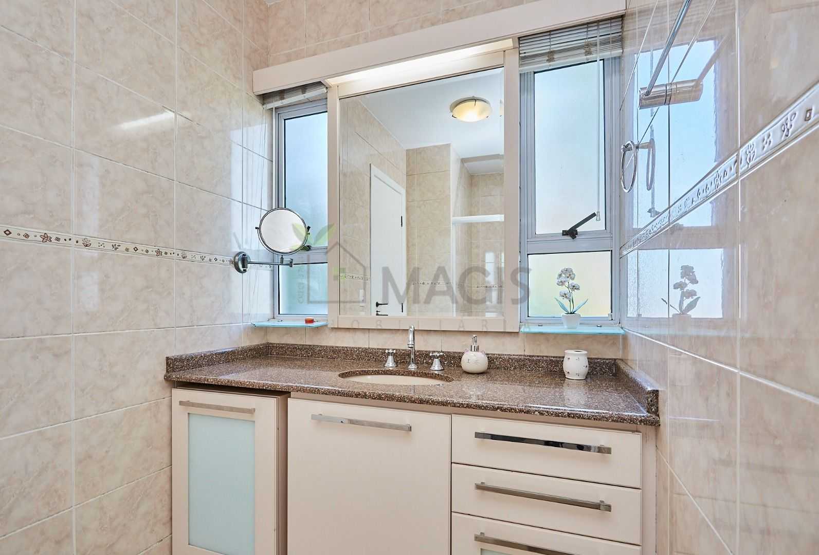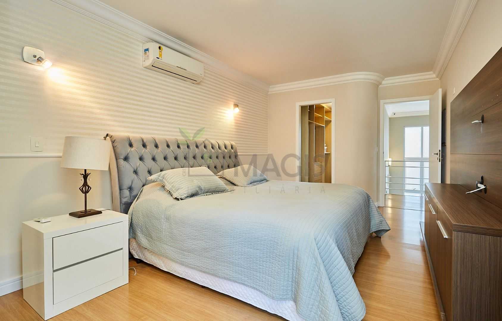 Suíte master exclusiva: amplo closet, banheiro com hidromassagem e bancada com cubas duplas.