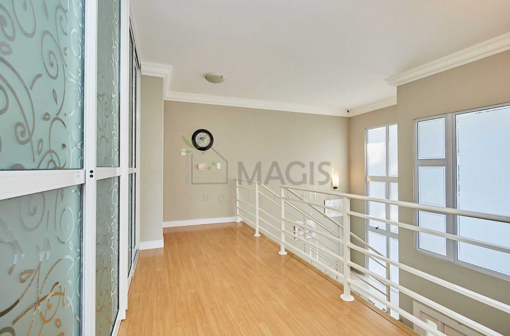 Pavimento superior sofisticado: mezanino multifuncional, home office com vista panorâmica e três suítes com sacada.