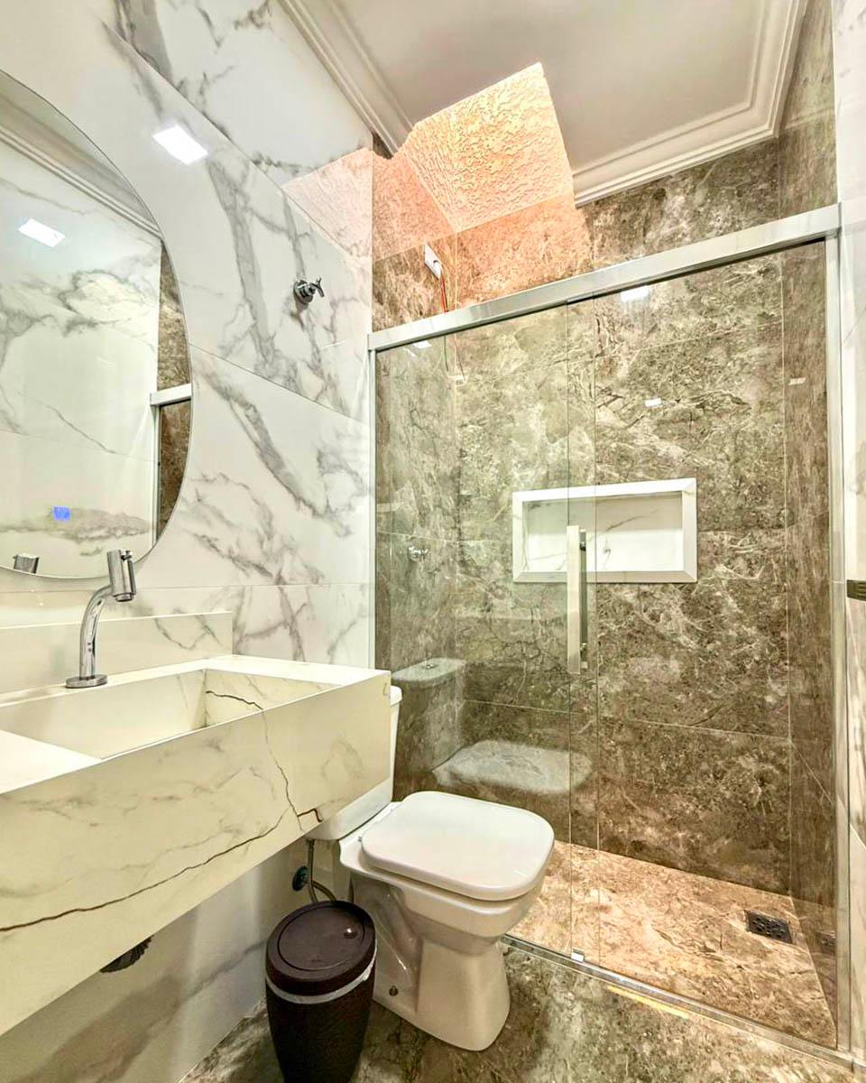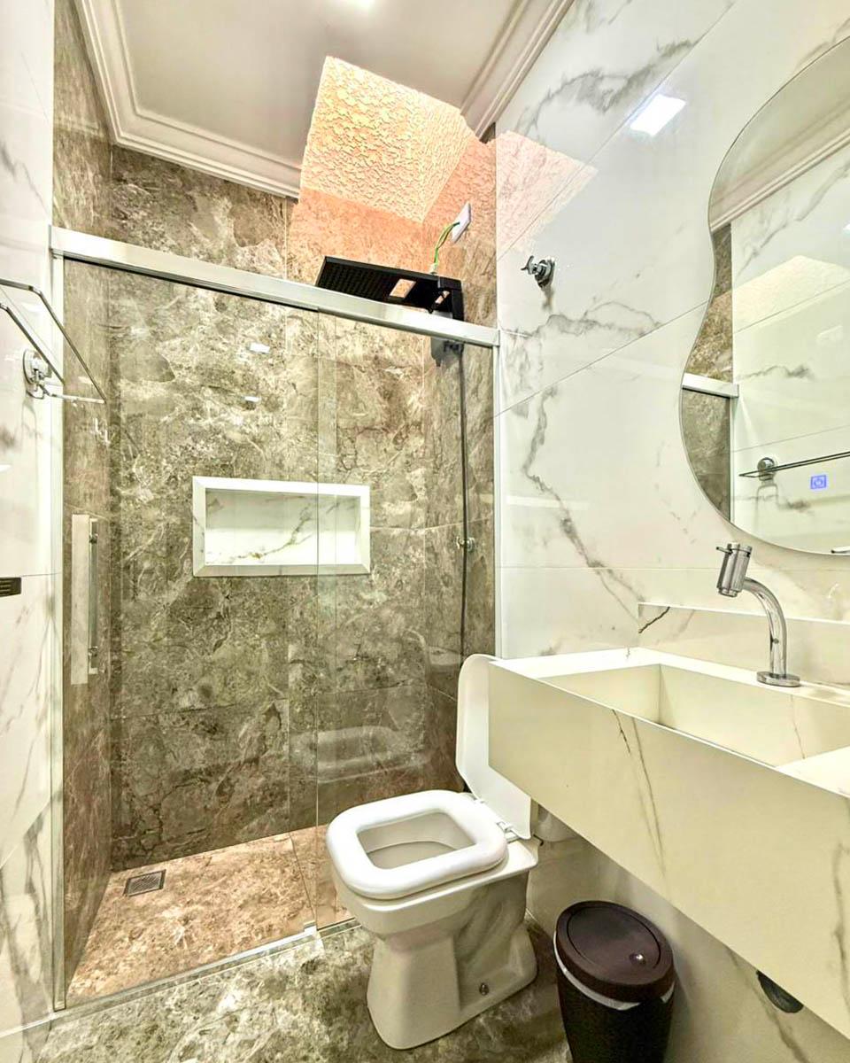 Banheiro com box em vidro, pia esculpida e nicho