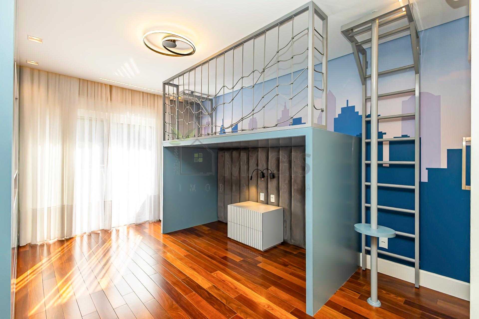 No piso superior, encontram-se 4 amplas suítes, todas climatizadas. A suíte master oferece closet e banheiro com pias e duchas duplas. O mezanino, com sua charmosa lareira, torna-se um ambiente íntimo perfeito para relaxar, com vista para o verde.