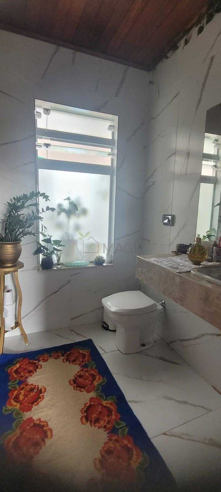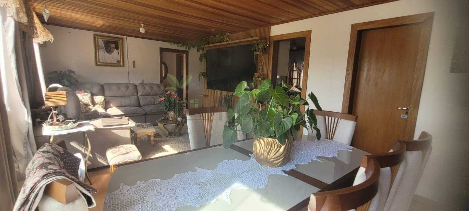 Casa principal com 255 m², 3 quartos (1 suíte), ampla sala, cozinha, 3 banheiros, sótão, varanda, garagem, churrasqueira coberta e área externa com lajotas (207 m²).