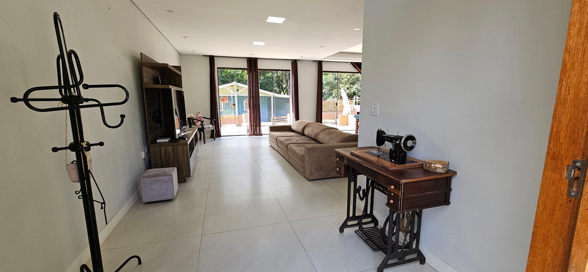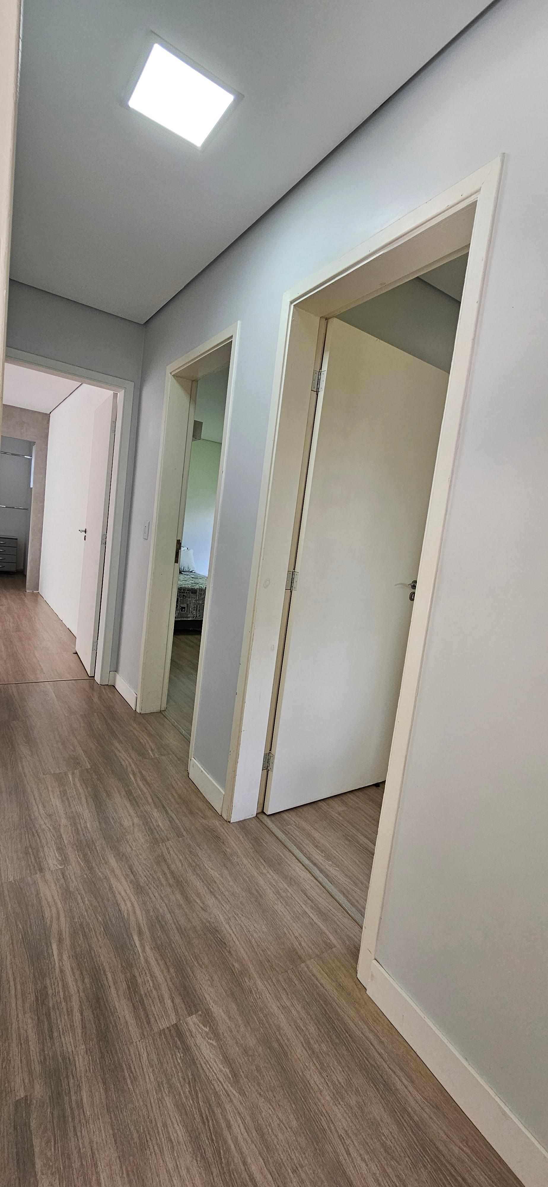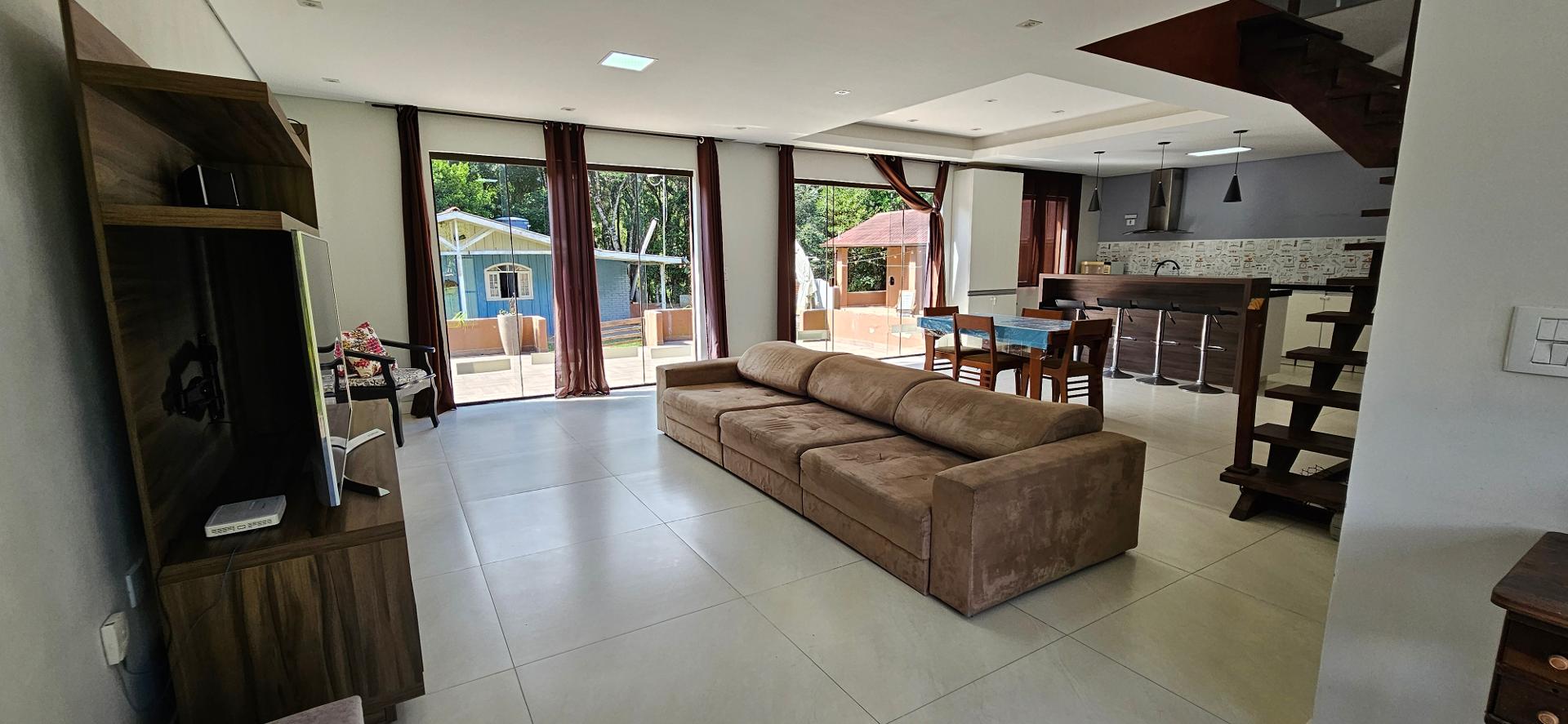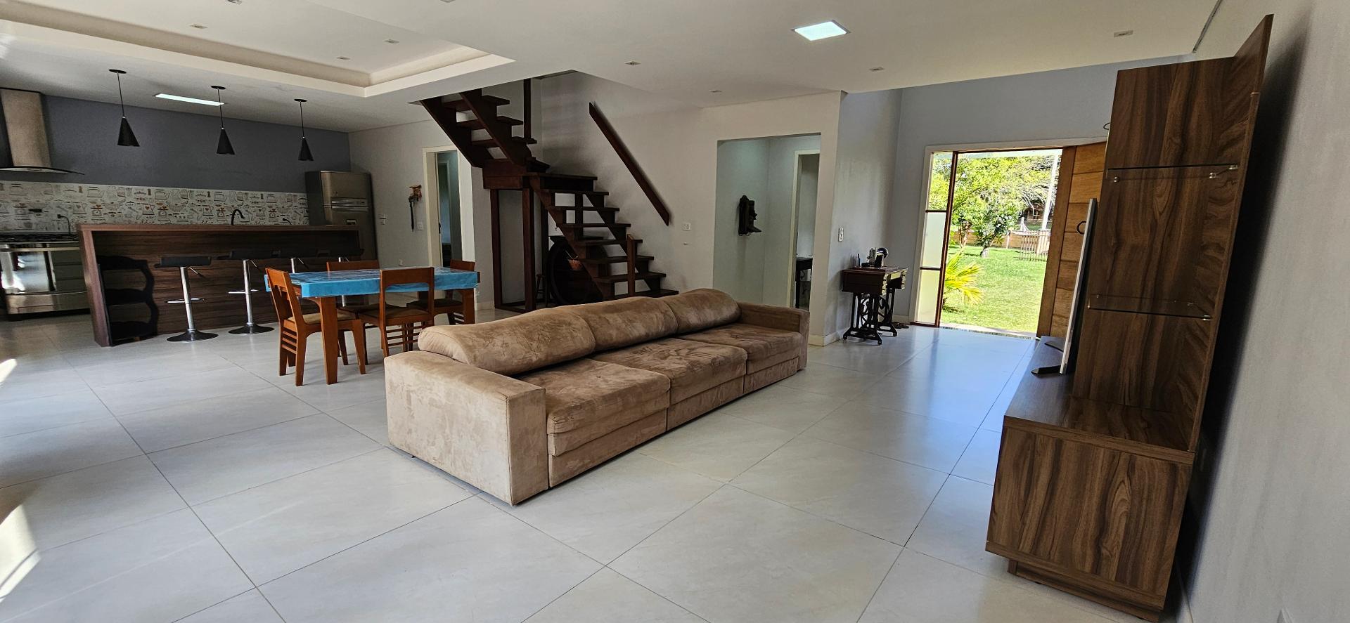 Sala de estar integrada à cozinha, salas e lavabo, com porcelanato 85x85.