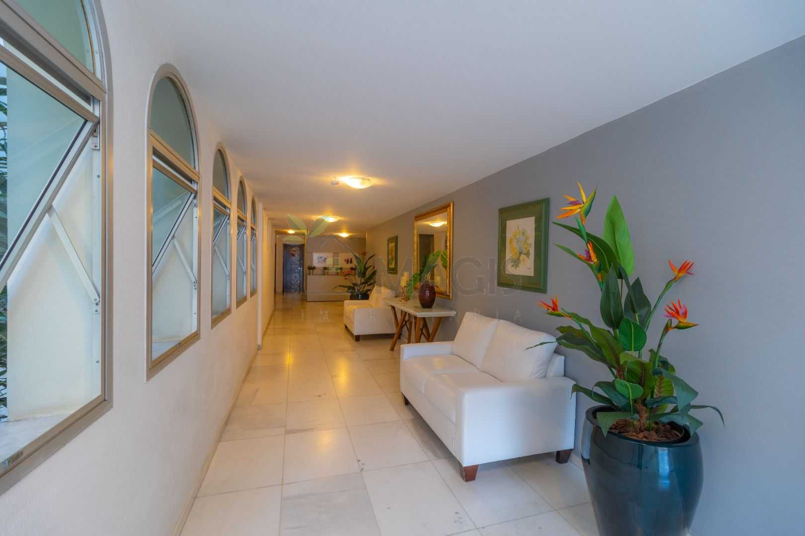 Salão de festas e jardim no piso térreo, com hall de entrada em mármore branco.