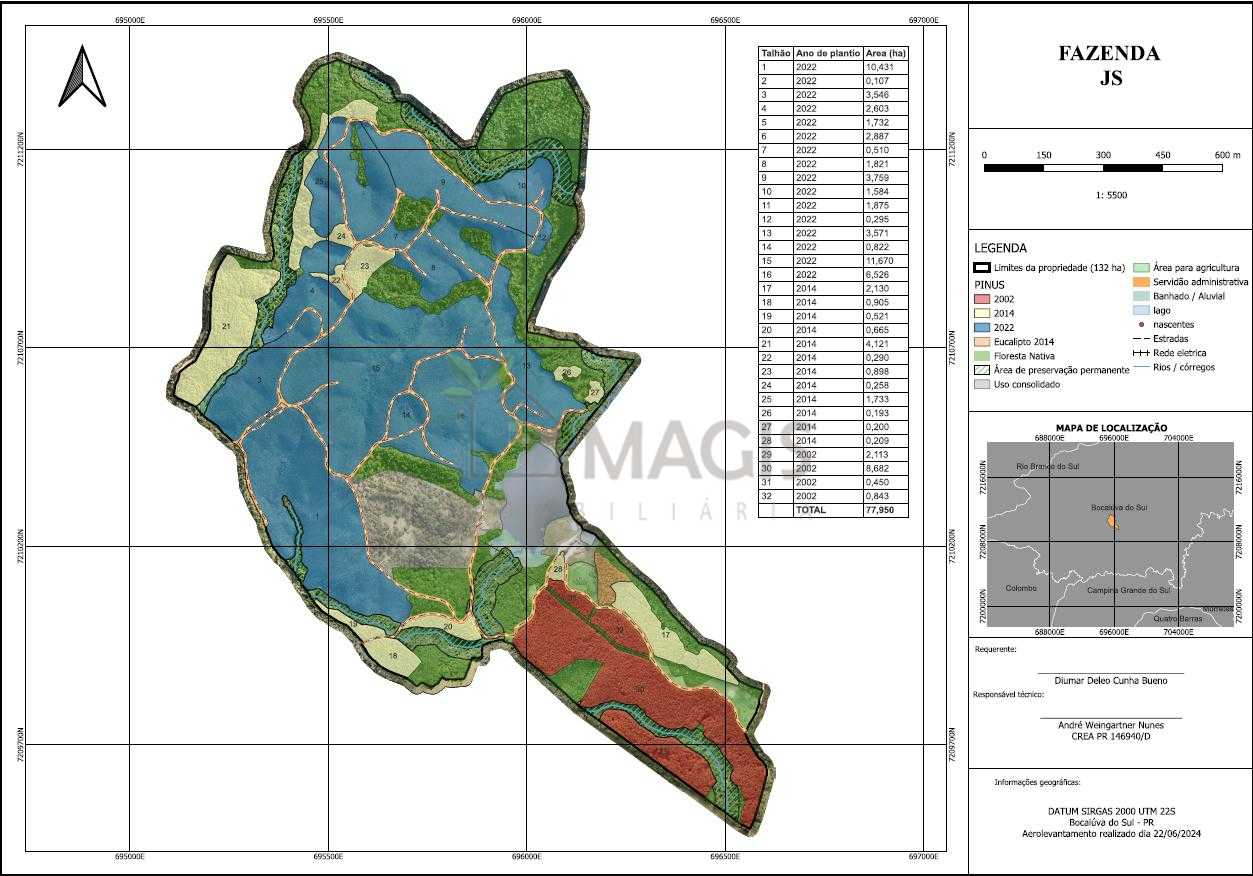 Madeira de Pinus Incluída: O comprador terá à disposição R$ 2 milhões em madeira de pinus, uma área de 77,95 hectares (conforme zoneamento), garantindo um retorno financeiro imediato.