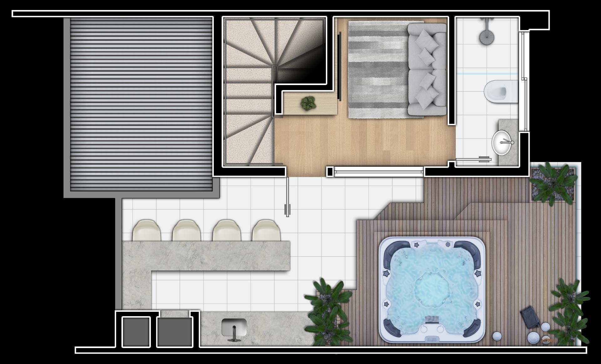 Terraço com espaço para home office, estar íntimo ou mais uma suíte com banheiro completo, espaçosa area descoberta com infra para jacuzzi e espaço gourmet.