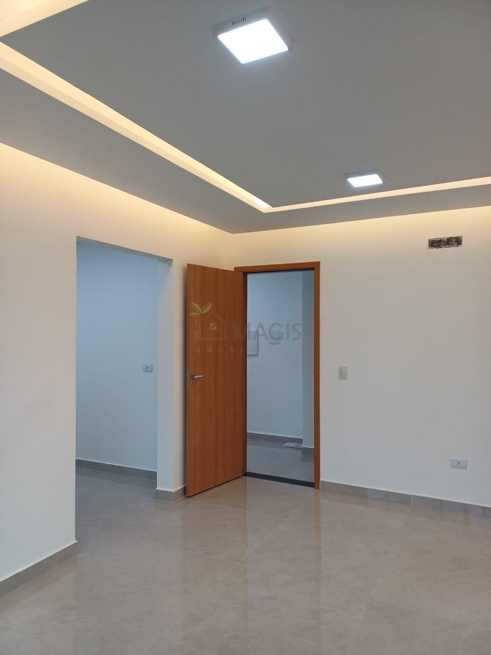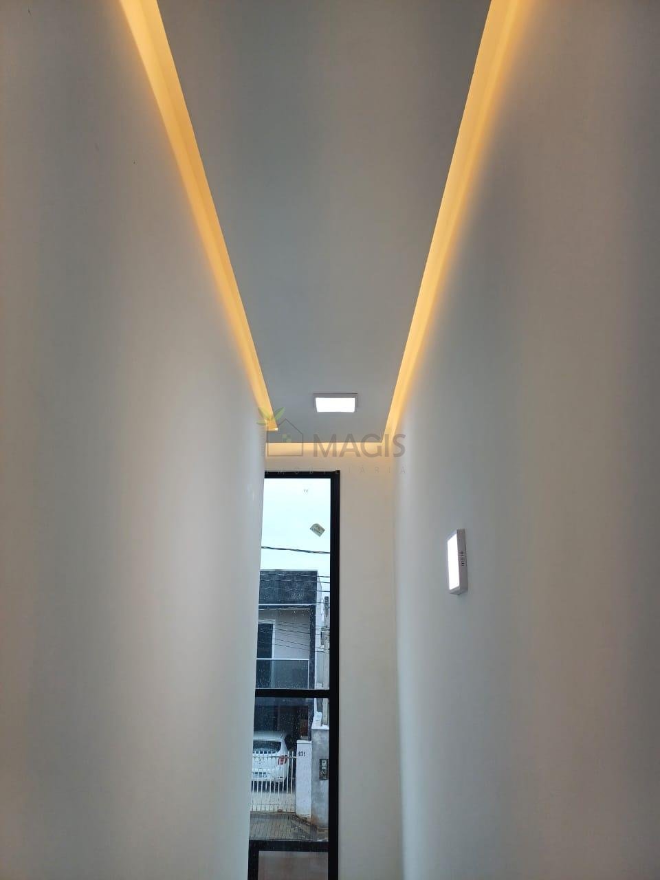 - Sala de estar, jantar e cozinha integradas com acabamento em gesso e iluminação embutida